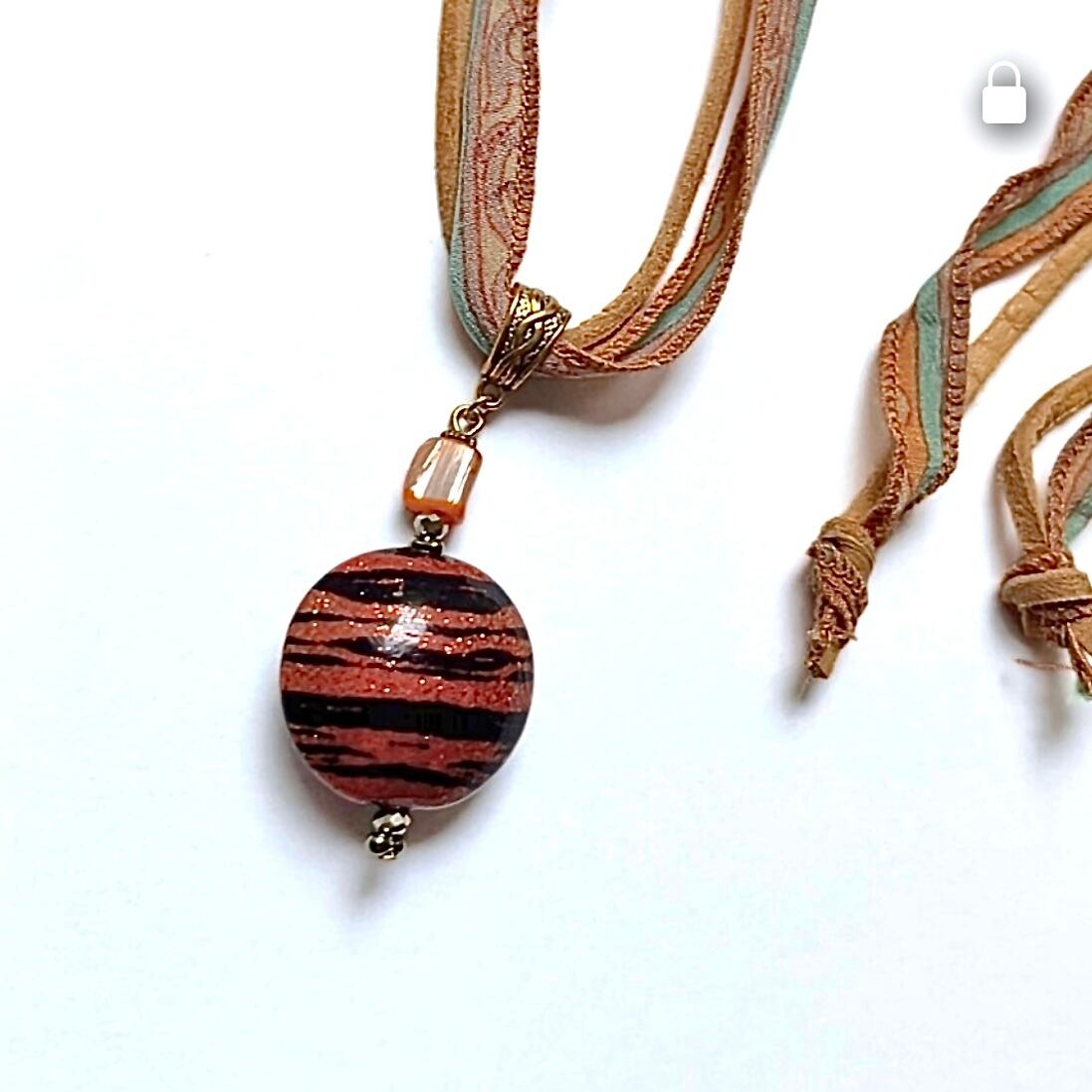 エスニック感が洒落たシルクリボンと白蝶貝ビーズ、上質な鹿革紐でお仕立てしました
