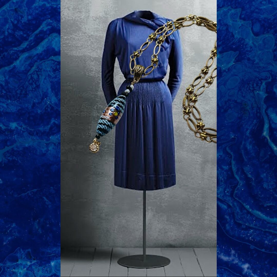 ビーズの差し色のコバルトブルーからは、ラピスラズリや元祖バレンシアガのエレガントなドレスを想起しました!小粒な差し色が効果的