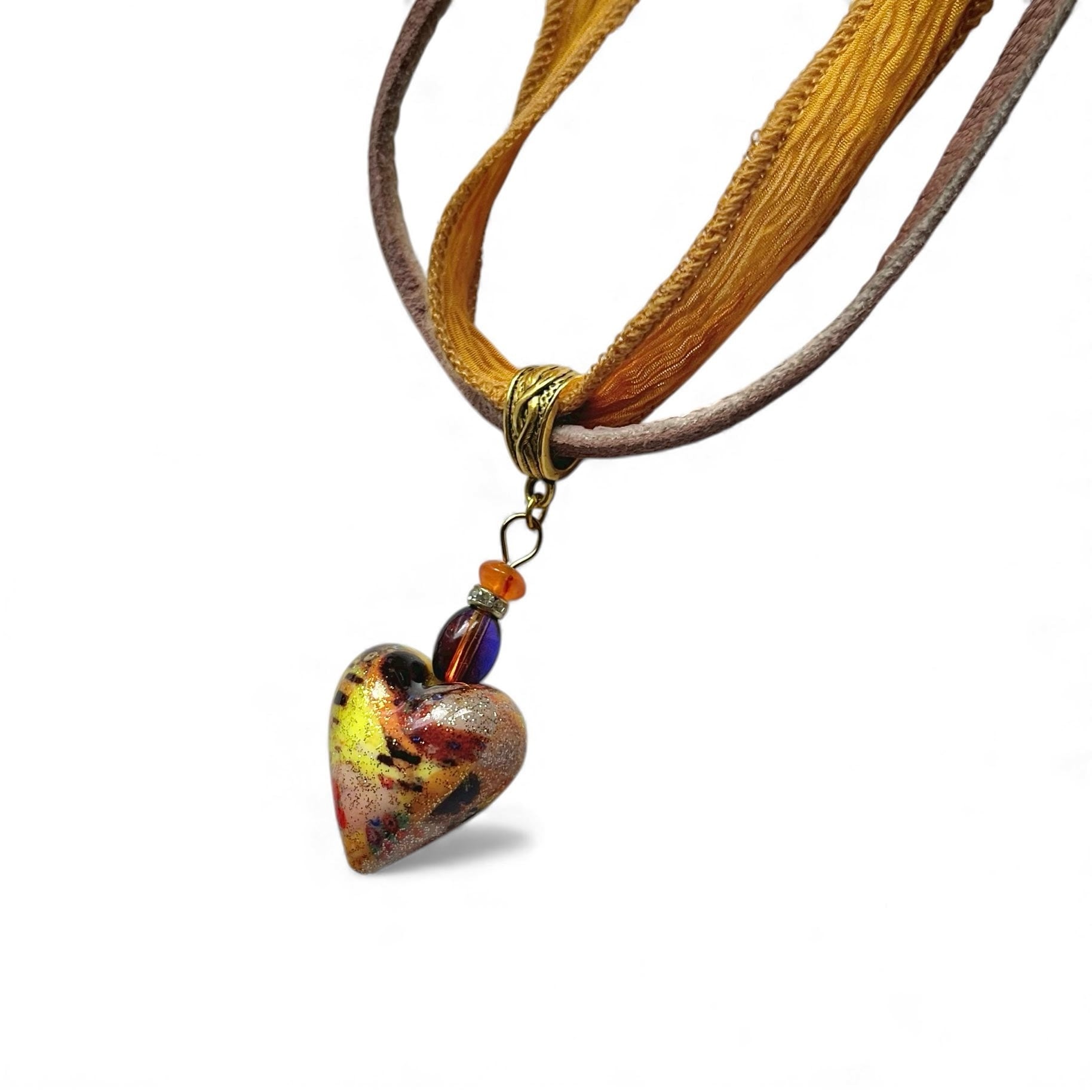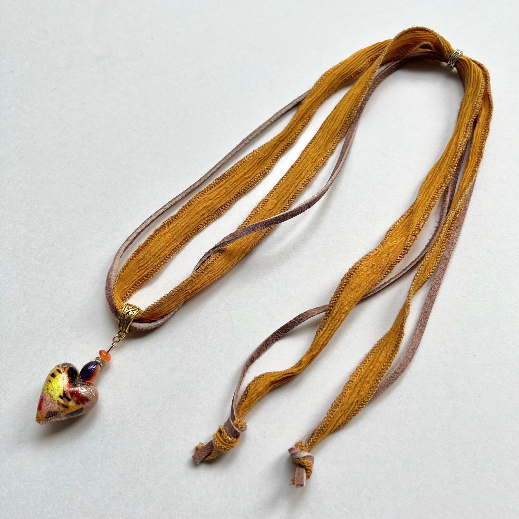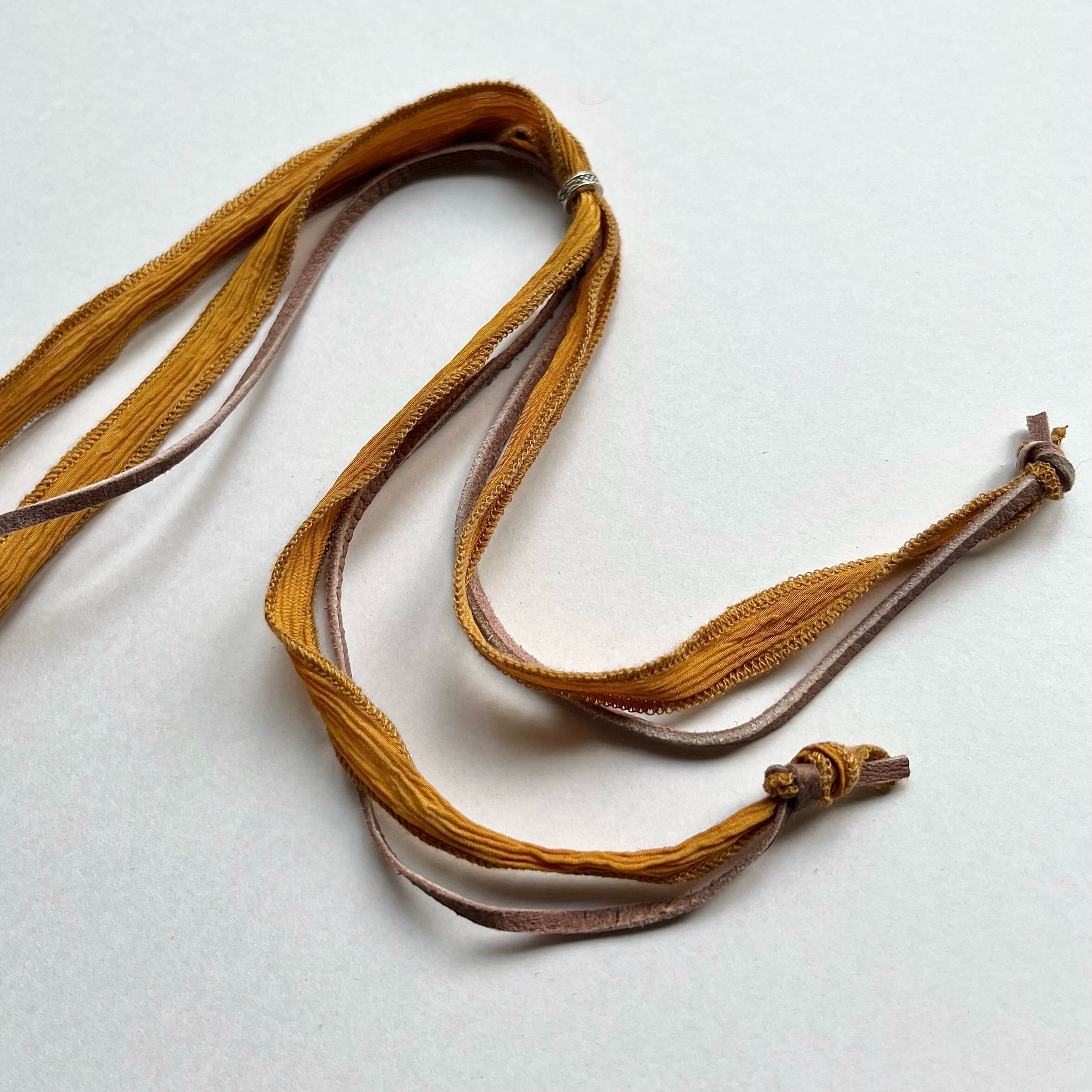 シルクリボンは辛子色、鹿皮紐は金茶色でどちらも肌あたりと軽さ抜群♫