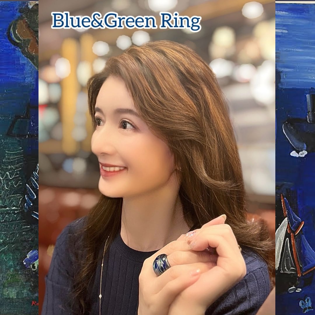 繊細な銀ベースに、鮮やかなマリンブルーと新緑の様なグリーンの流線形