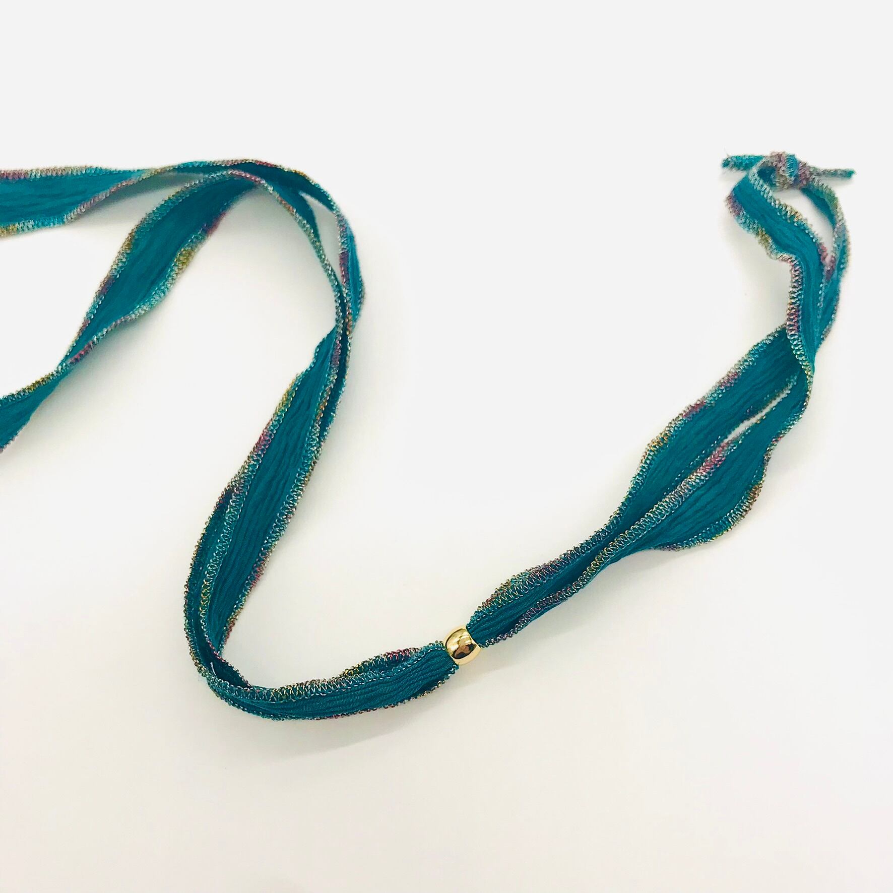 手染めシルクリボンは深みのあるティールグリーンに、ホログラムラメ系の縁取り。