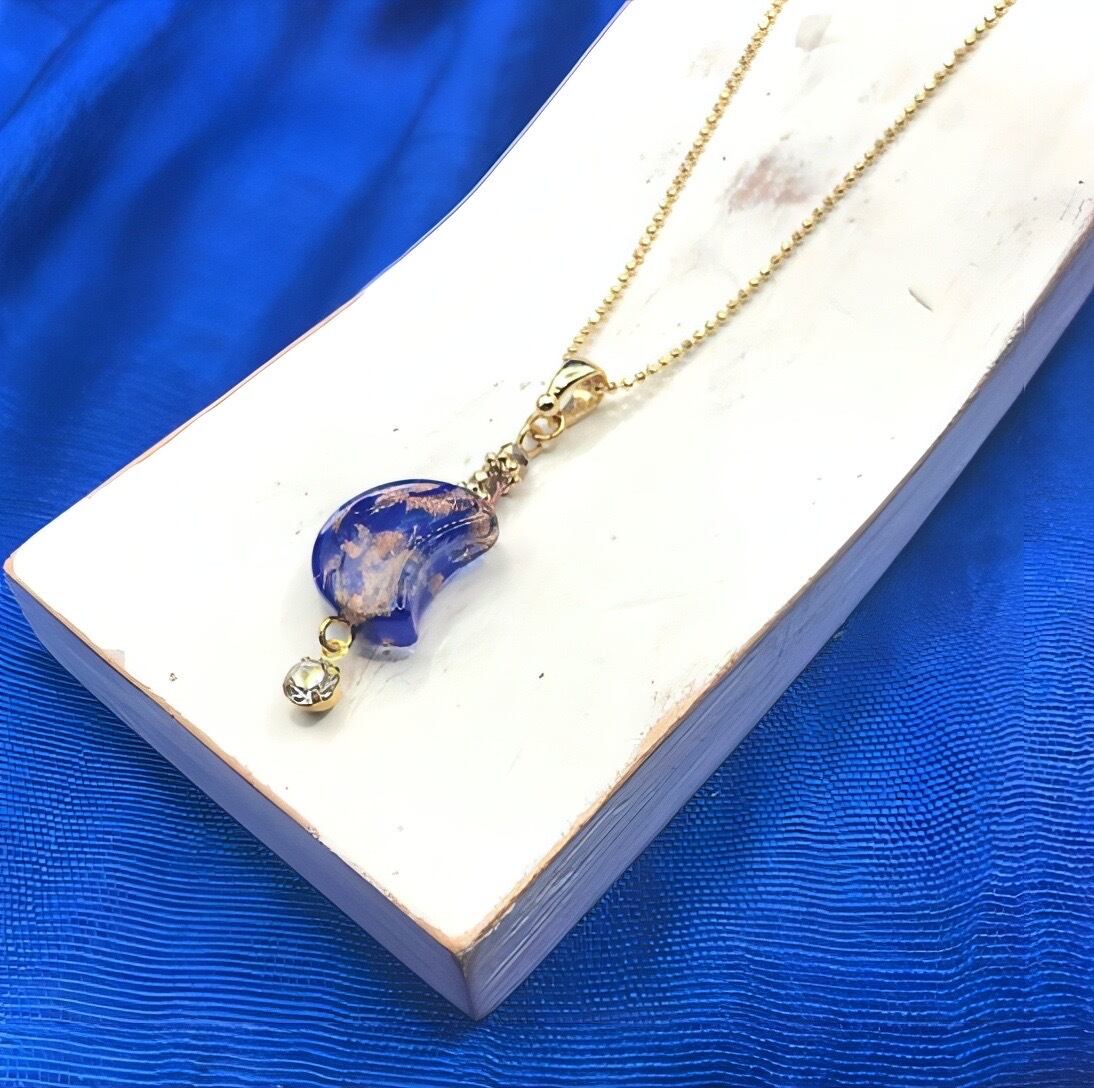 コバルトブルーに純金粉の輝きが幻想的な、三日月モチーフのベネチアンビーズネックレス。