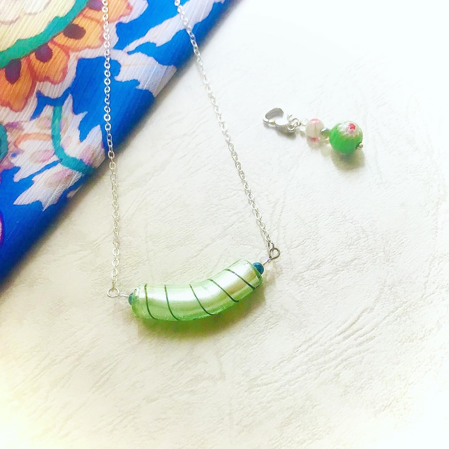 スペアミントカラーが爽やかな、バータイプネックレス。ベネチアンビーズならではのシルバー925箔の明るい輝きに、クラフト感のあるストライプが魅力的です。艶々で美しい✴︎