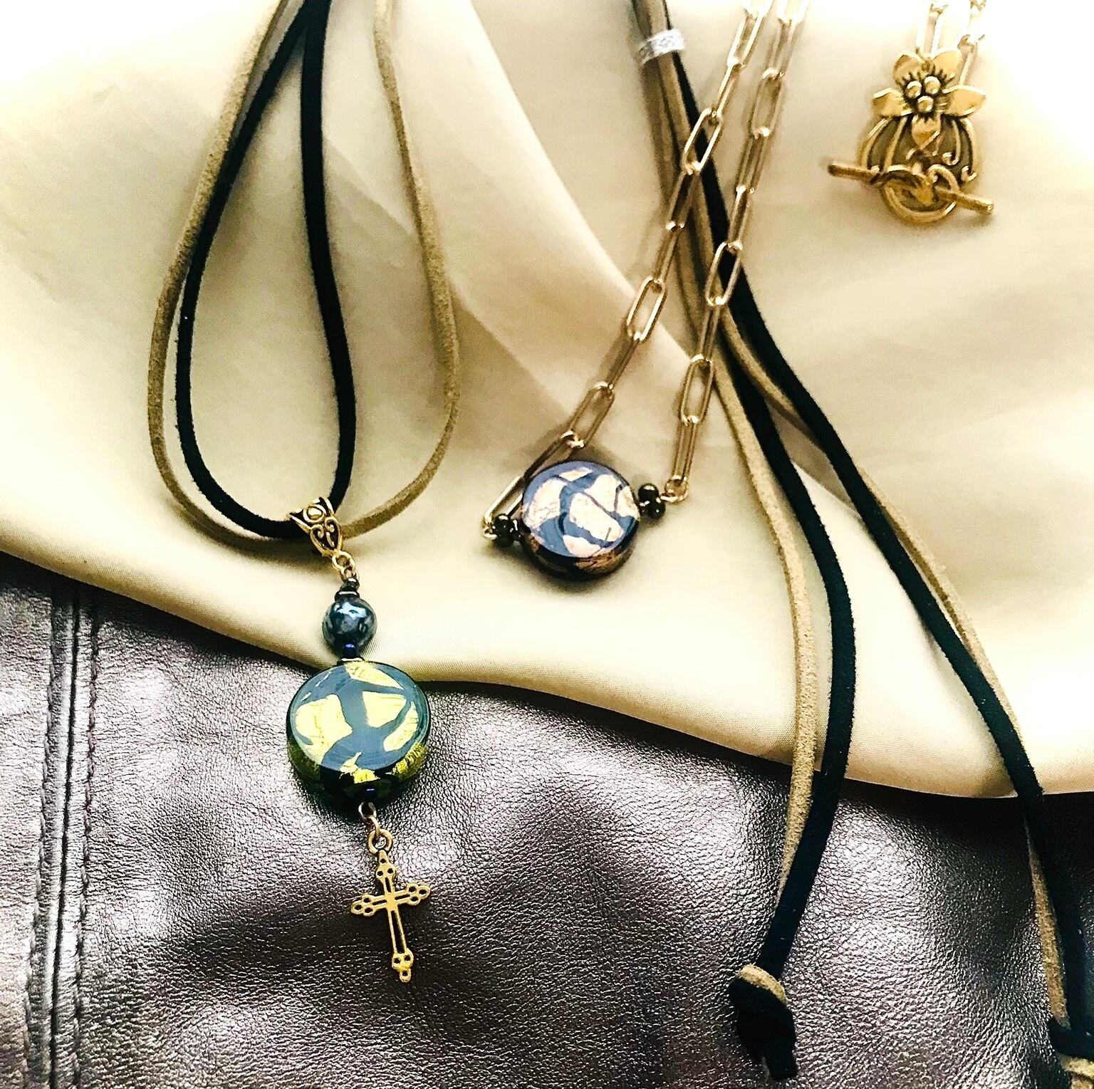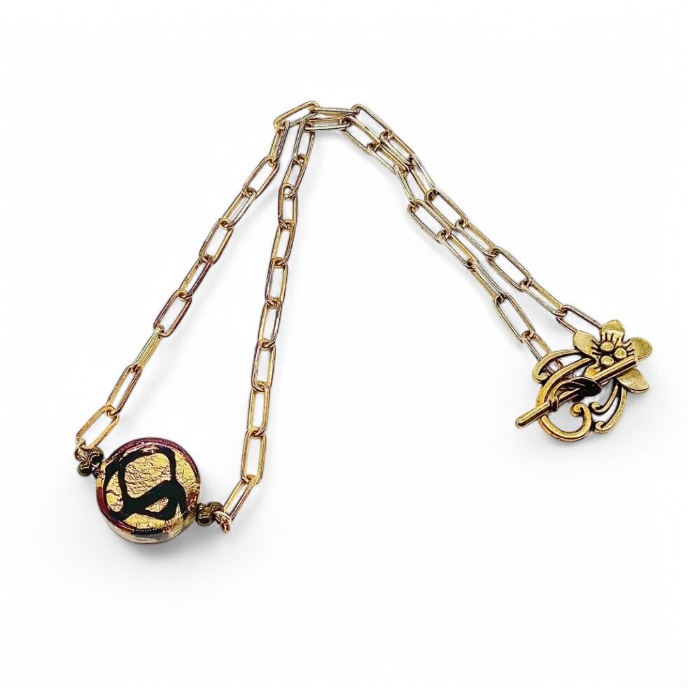 金箔の上にパープルのベネチアンガラスで覆われているせいか、美しいブロンズのディスク型ビーズのチェーンネックレスです。