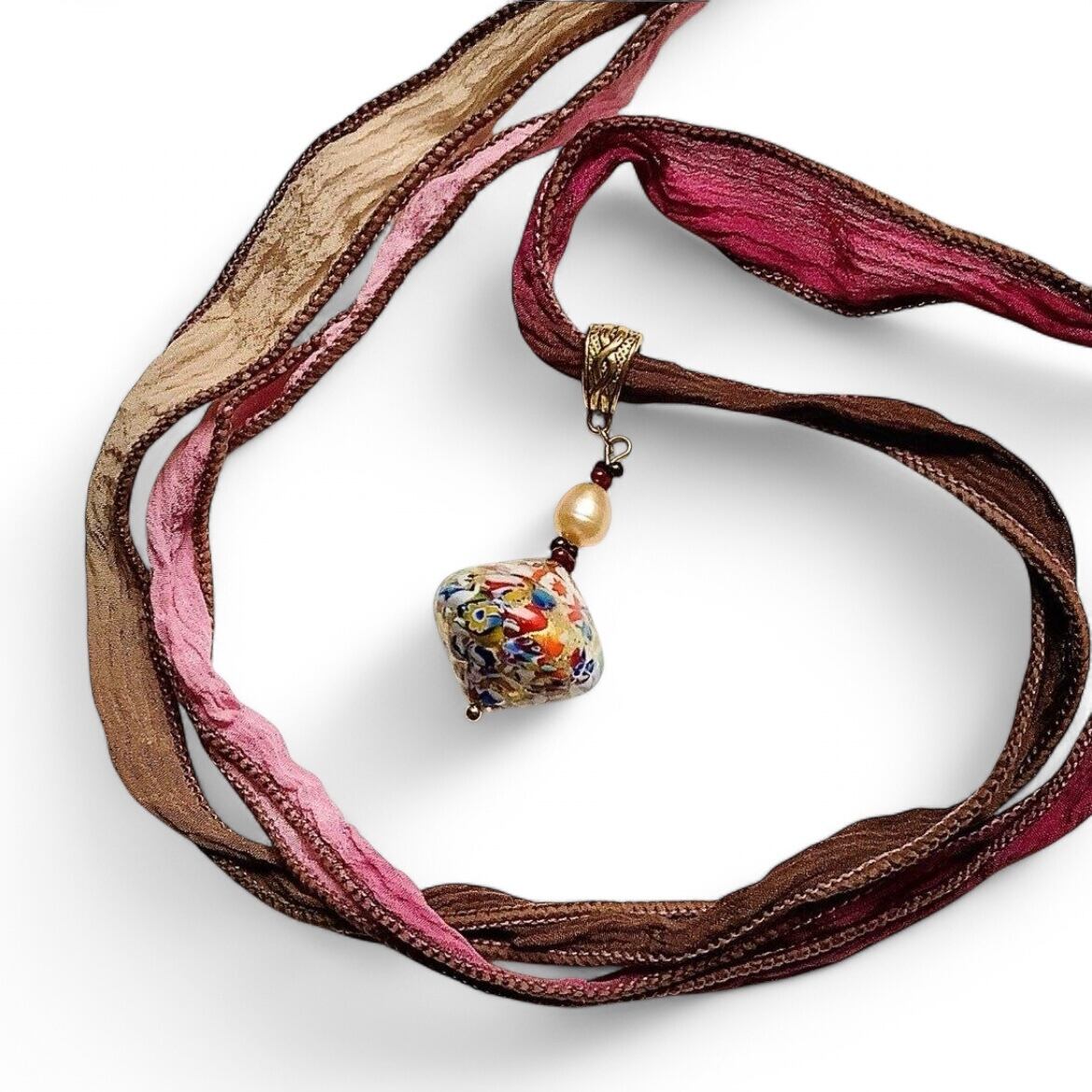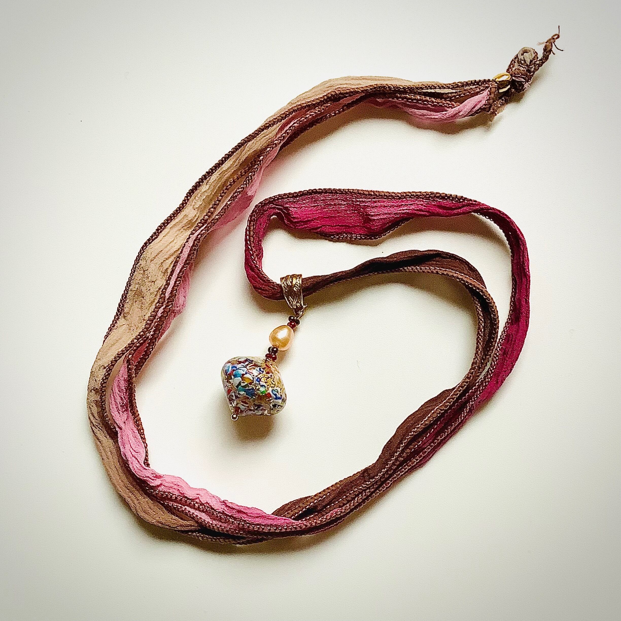 クリムトビーズは大ぶりで、シルクリボンの長さも1m弱とたっぷり。