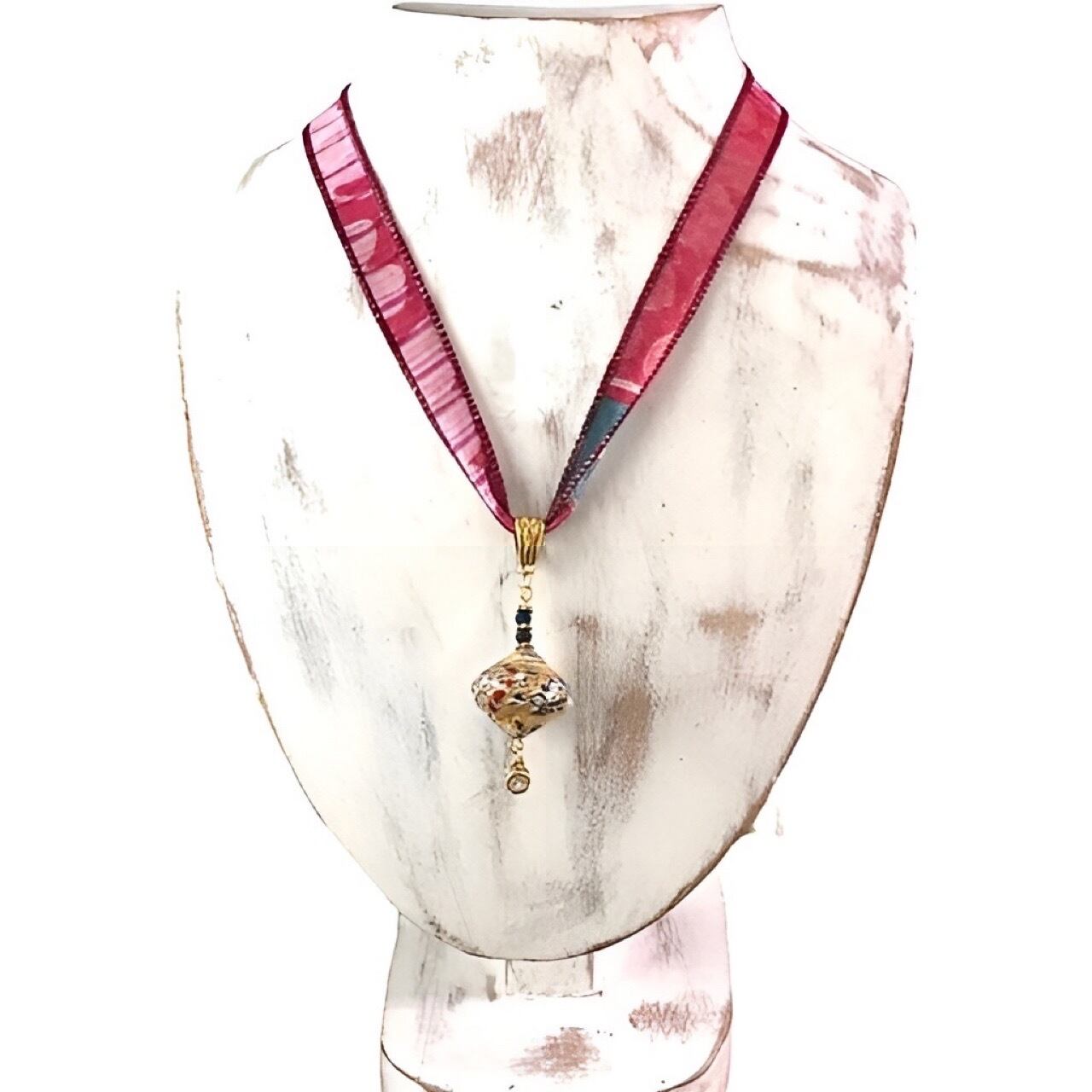 ネックレスはミル打ちでゴールドフィルドのジルコニアチャームが揺れて、華やかなサリーシルクのリボンにクリムトビーズ