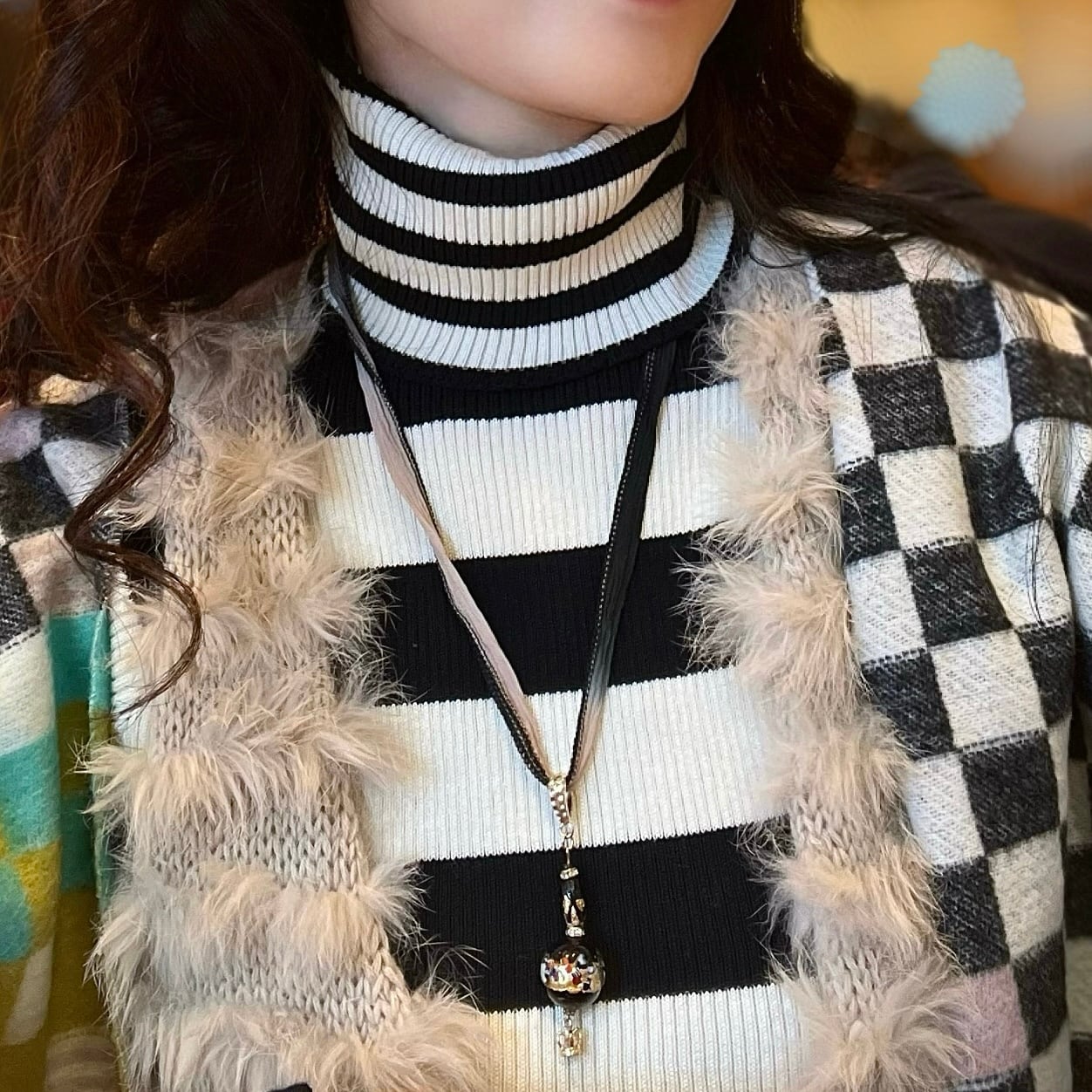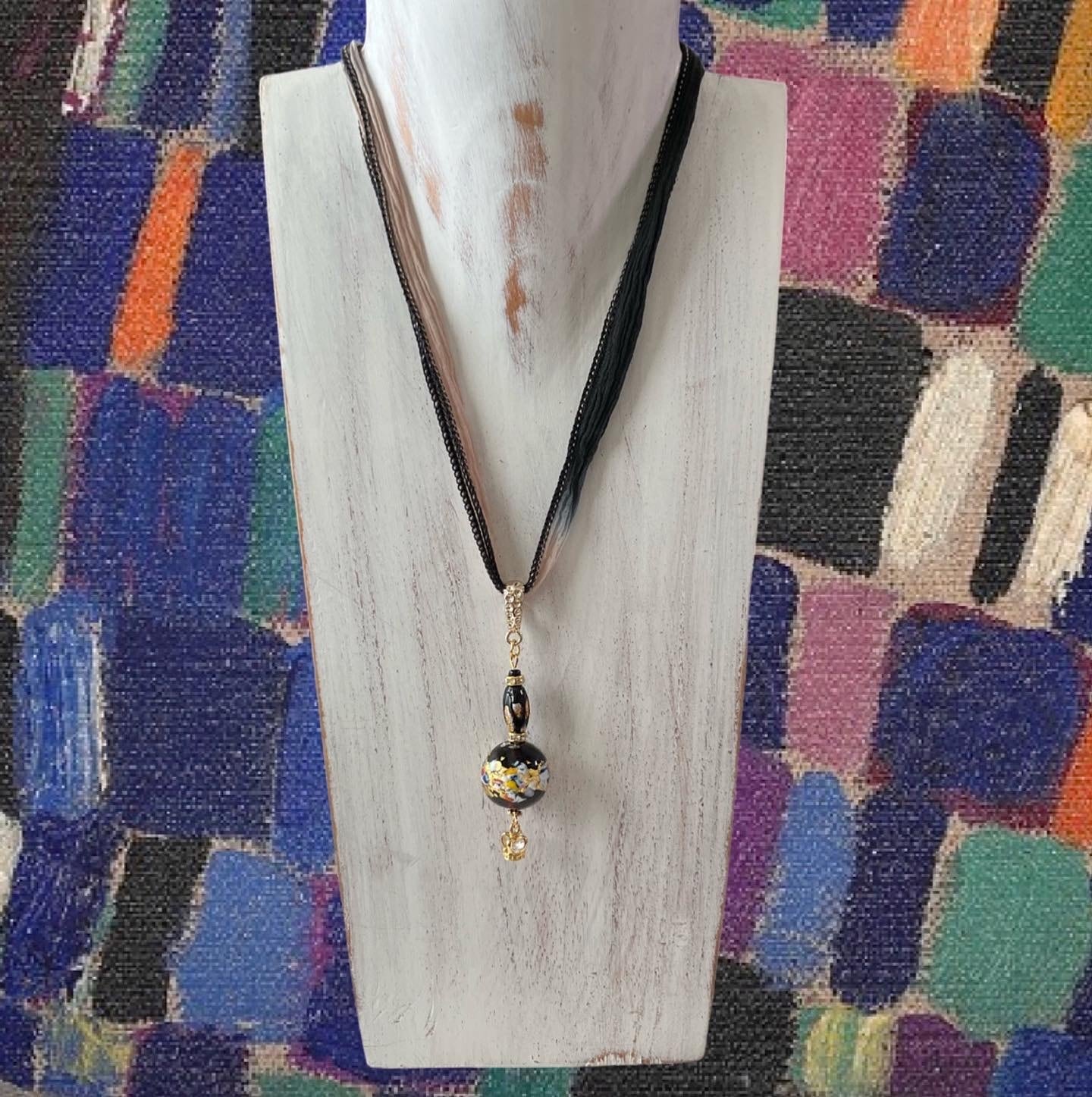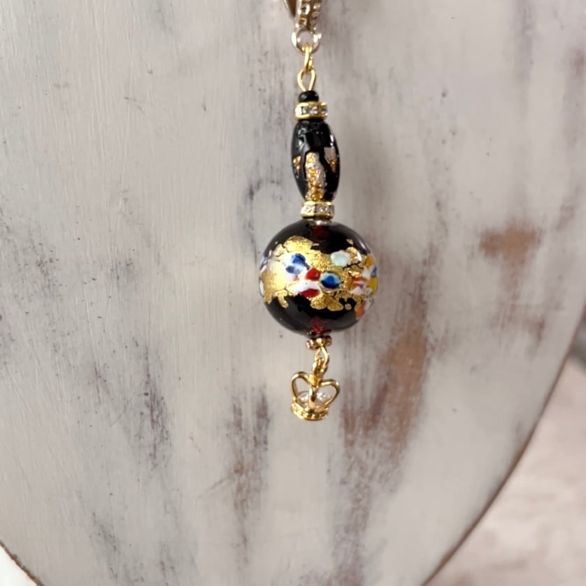 存在感あるブラックの球体に、金箔とカラフルなミルフィオリガラスのコントラストが美しい