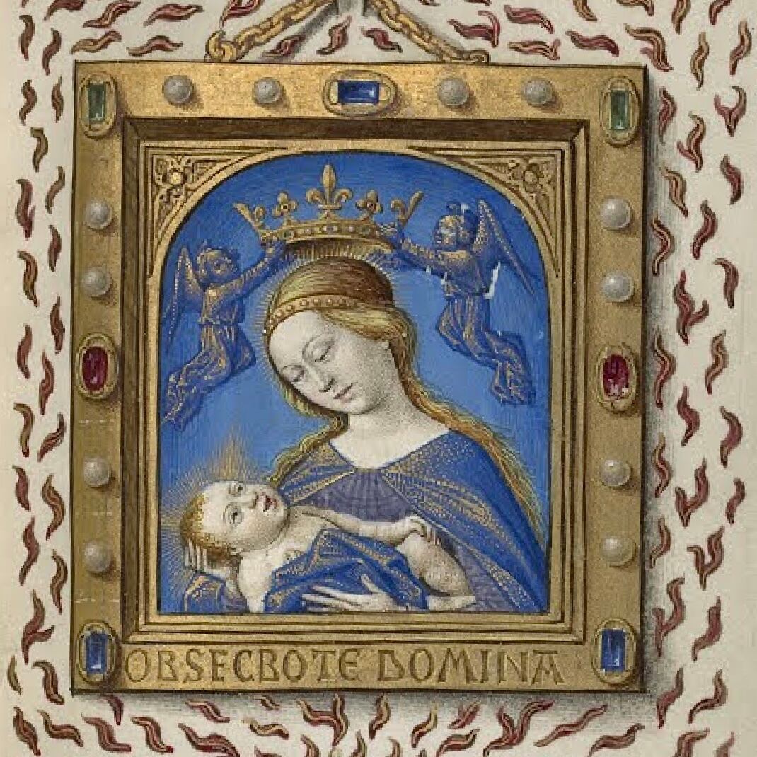 時事録の冒頭の聖母像は、カラフルな宝石が額縁に散りばめられて賛美を表しています